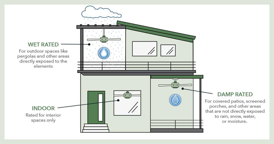 Ideal for areas that have no direct contact with rain, snow, or ice, damp-rated fans can handle moisture like a pro, but they're not designed to receive immediate exposure to water. Consider installing a