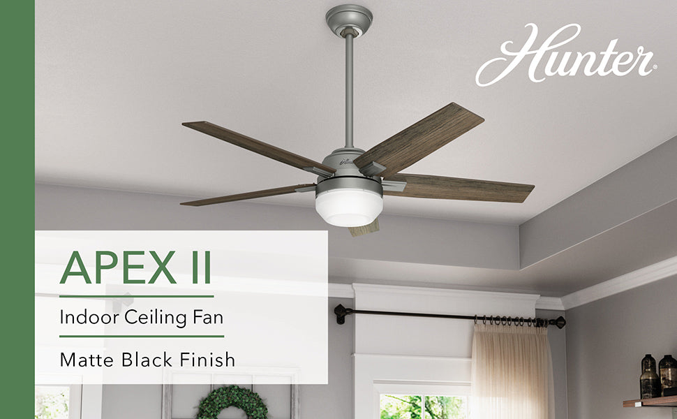 The Apex II ceiling fan with remote control is a modern take on traditional ceiling fan design. Designed for your large bedrooms and living rooms, the handheld remote makes it easy to adjust the energy-efficient LED light and fan speed from anywhere in the room. The Apex modern ceiling fan features our three-speed WhisperWind® motor that delivers ultra-powerful air movement and whisper-quiet performance for cooling power without the noise.