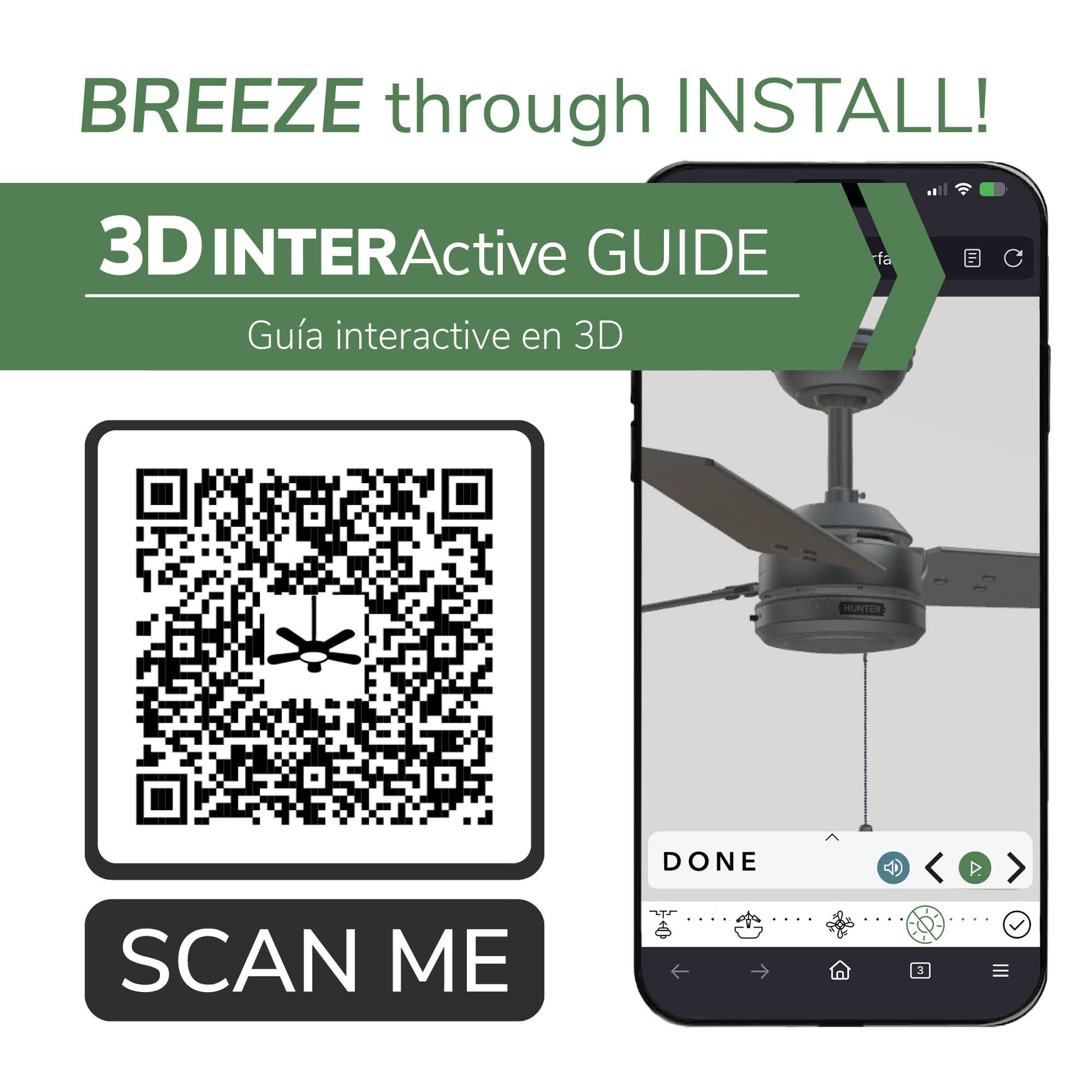 - DIGITAL MANUAL: Installation made easy with Hunter's 3D InterActive Guide—just scan the QR code for quick setup.