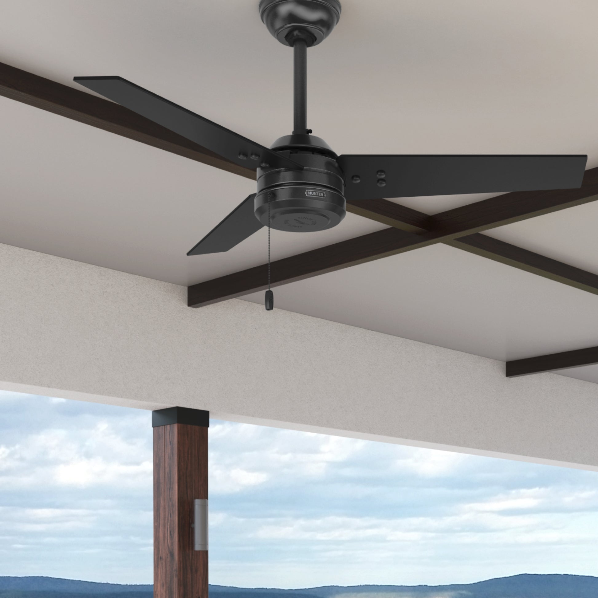 The Cassius outdoor ceiling fan is damp-rated and able to withstand moisture and humidity, perfect for covered patios and porches. This ceiling fan's clean lines and exposed hardware complement modern industrial and farmhouse-style indoor spaces as well. The 44-inch blade span on this small ceiling fan is the ideal fit for guest bedrooms, home offices, and small living rooms.