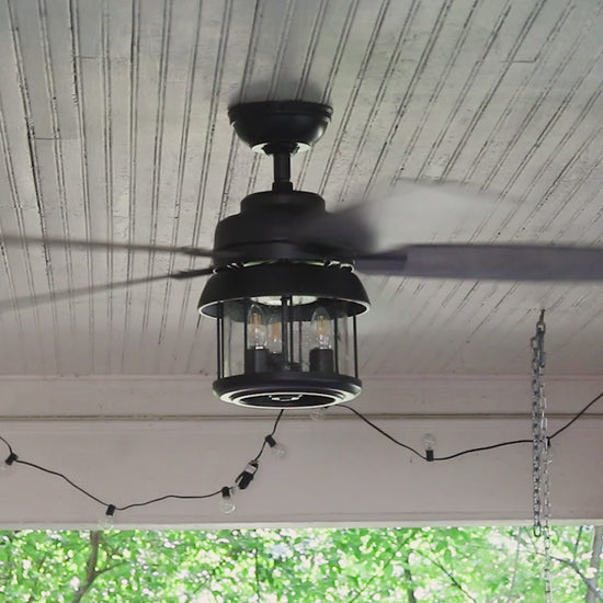 The Coral Bay chandelier ceiling fan features a lantern-style light fixture with three vintage, energy-efficient LED Edison bulbs encased in seeded glass. The Noble Bronze ceiling fan finish will complement your farmhouse decor. This rustic ceiling fan is damp-rated for use in covered porches and patios as well as indoor spaces like living rooms, bedrooms, and kitchens. The Coral Bay comes with a handheld remote for easy control of the fan speed and direction as well as lighting.