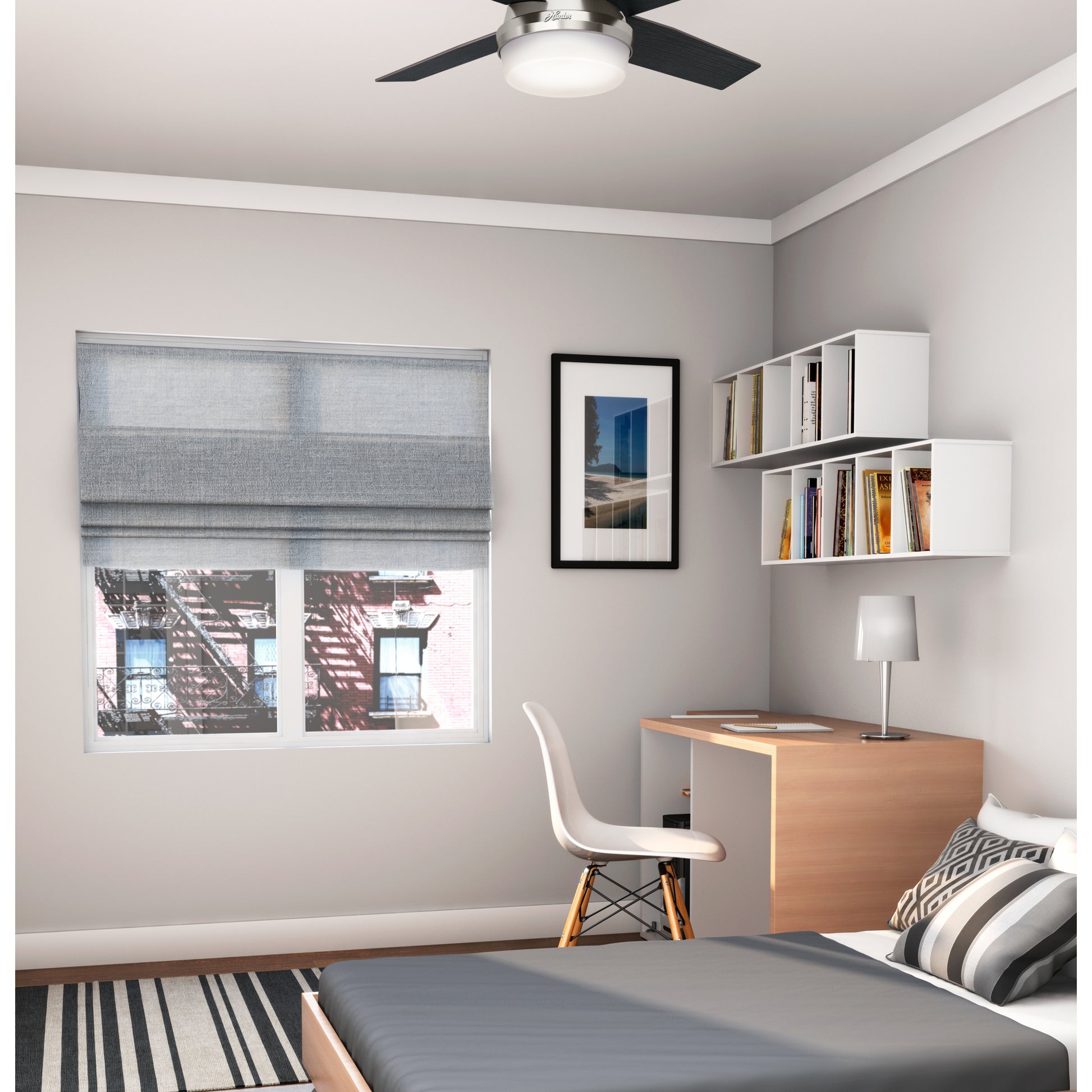 A contemporary fan with mass appeal, the Dempsey will fit flawlessly in your home's modern interior design. The beautiful, clean finish options work together with the high contrast of angles throughout the design to create a look that will keep your space looking current and inspired. Fully dimmable, energy-efficient LED bulbs give you total control over your lighting, while the 44-inch blade span is ideal for small rooms. We have a full collection of Dempsey fans so you can maintain a consistent look while tailoring the size and features to each room in your house.