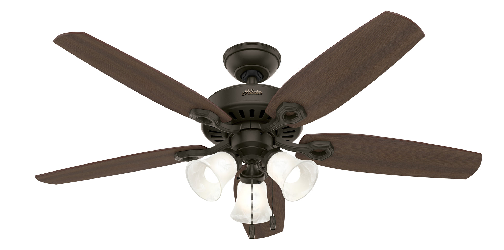 With a 52-inch blade span and low-profile design, the casual, traditional style of the Builder Low Profile will complement large rooms in your home without overpowering them. A mainstay in the Hunter® product line, this low-profile ceiling fan with lights features three-speed WhisperWind® motor technology to deliver quiet and ultra-powerful performance.