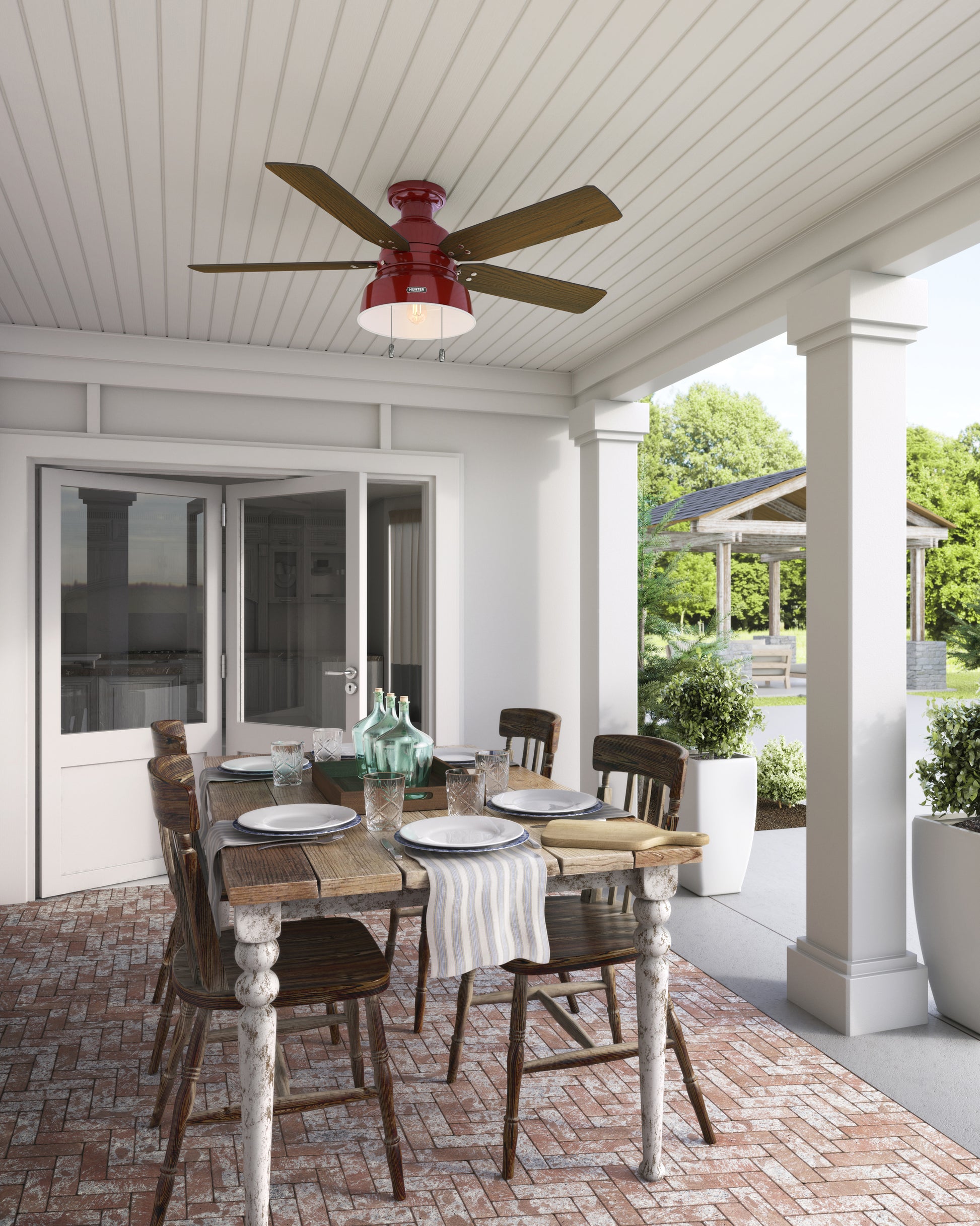 Industrial and rustic design come together on the Mill Valley low-profile ceiling fan with details including the vintage-looking rivets securing the blades, coin-edge thumbscrews, and barn-style open hood light. Style meets performance with the Mill Valley's white hood reflector that maximizes light from a vintage-style energy-efficient LED Edison bulb. Perfect for areas exposed to moisture and humidity, this damp-rated fan completes the look of casual farmhouse living spaces or patios with low ceilings. The Mill Valley Collection is available in a variety of finishes and mounting options to customize the look of your room's rustic home decor while maintaining a consistent style throughout your home.