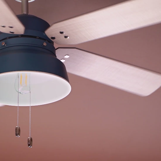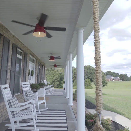 Industrial and rustic design come together on the Mill Valley with details including the vintage-looking rivets securing the blades, coin-edge thumbscrews, and barn-style open hood light. Style meets performance with the Mill Valley's white hood reflector that maximizes light from a vintage-style energy-efficient LED Edison bulb. Perfect for areas exposed to moisture and humidity, this damp-rated fan completes the look of your casual farmhouse living spaces or patios. The Mill Valley Collection is available in a variety of finishes and mounting options to customize the look of your room's rustic home decor while maintaining a consistent style throughout your home.